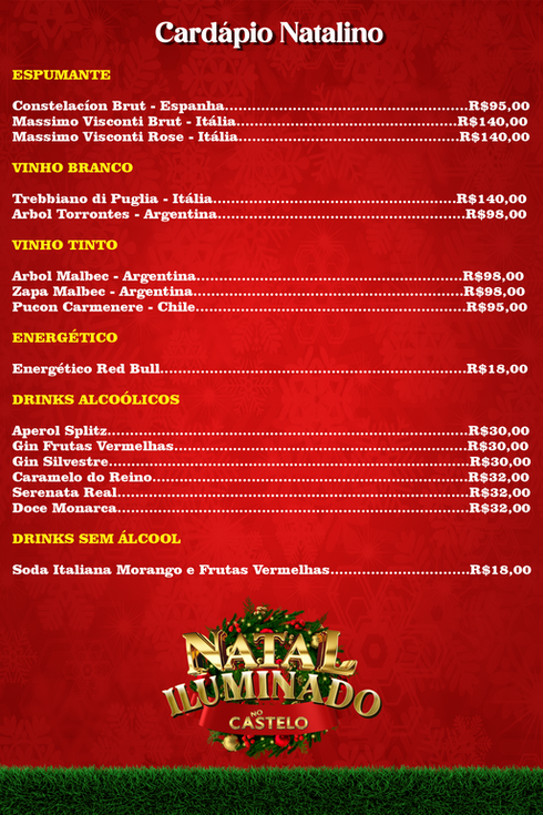 Para quem deseja brindar a noite com um toque especial, o evento contará com uma seleção exclusiva de bebidas vendidas à parte. Entre elas, vinhos, espumantes, refrigerantes e drinks natalinos autorais, preparados especialmente para celebrar a data com sabor, elegância e personalidade. São opções perfeitas para quem busca um brinde festivo ou deseja complementar a experiência com bebidas diferenciadas.