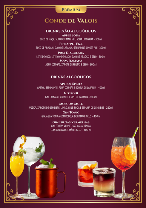 Caipirinhas, Aperol Spritz, Negroni, Moscow Mule, Gin Tonic, Gin Frutas Vermelhas, Apple Soda, Pineapple Fizz, Pina Descolada e Soda Italiana