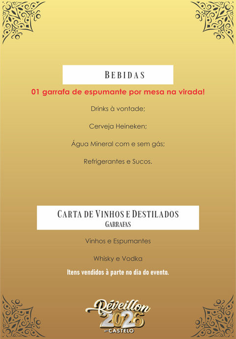 No Réveillon do Castelo Vale dos Sonhos, cada mesa tem direito a 01 garrafa de espumante com balde de gelo, para celebrar a virada do ano em grande estilo.