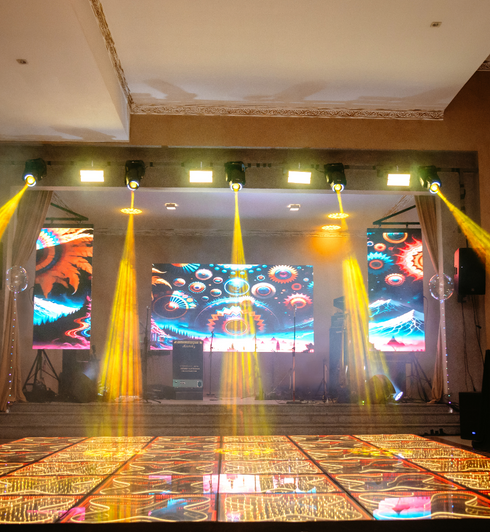 Eventos do Grupo: Ajustamos a iluminação, trilha sonora e painéis para criar cenários totalmente personalizados.